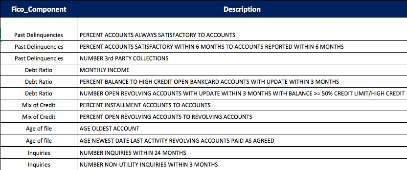 Our team trained FICO score as a dependent variable (call me for a crash course on statistics, no time to explain, we have 30 minutes) and fixed over 500 credit attributes as independent variables. After a few tries of stepwise regression analysis. We actually came pretty darn close.