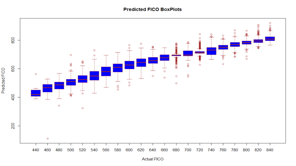 The Y-axis is our “Predicted FICO” and X-axis is the actual FICO score. Grade school math tells us that if the value of the x-coordinates is exactly the same as the value of the y-coordinates, then X (actual FICO) and Y (predicted FICO) is exactly the same.