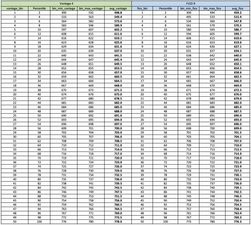 We binned this dataset by their perspective credit score ranges. For example, the top bin of our Vantage 4 score which contains 2% of the population has a score range of 300 to 532 with an average Vantage 4 score of 498.8. The same top bin from FICO 9’s top 2% population bin has a range or 300 to 494 with an average of 459.2. Three is almost a 40 point difference.