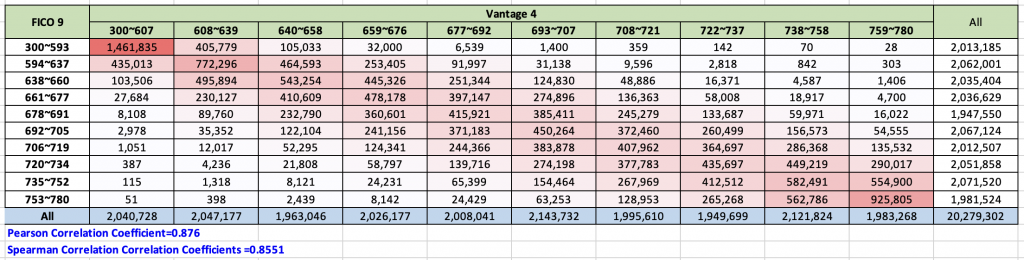 As an extremely example, there are 28 people in the FICO score 759 to 780 bin that Vantage deem to be deep subprime between 300-593. On the opposite side, there are 51 people which Vantage deemed to be extremely high quality but FICO says they are in the 300-607 range. These anomalies are hard to explain and we believe it’s likely due to lack of information and each scoring algorithm has a difference in their missing value replacement sub-routine that could cause this disagreement in their assessment.