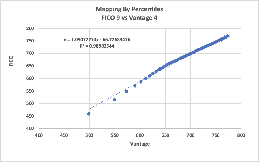 We when plot the average values from FICO 9 vs. Vantage 4, we see that they are very close to each other with a Linear Regression R-squared value of 0.98983544 (virtually identical to each other).