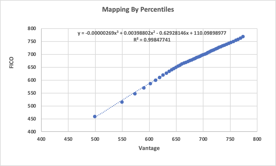 Vantage score consistently scores higher than FICO score below 600 score range. Once again, we are not making a statement about the effectiveness of these scores but simply identifying the trend and differences between these two scores.