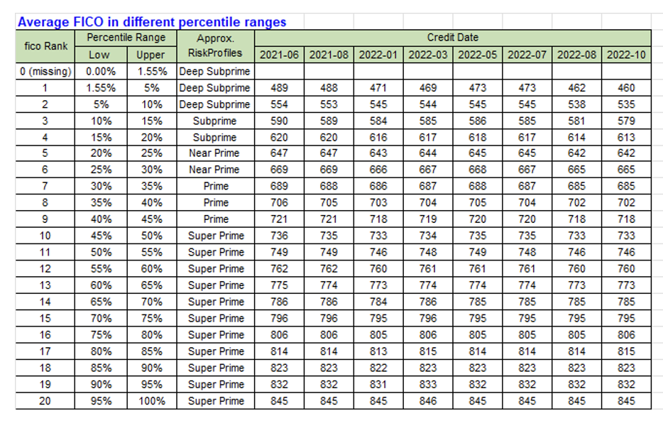 We sampled over 180 million US consumers over a year and a half from June 2021 to Oct 2022. And from a border perspective, average FICO score fell give points on average from 720 to 715. This drop in FICO score is a reflection at the inflection point in June 2021 when inflation rises to an uncomfortable 7 to 9% month over month metric.