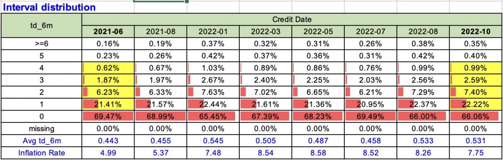 The first credit attribute we analyzed is “Number of trades opened in the past 6 months – (td_6m). The Y-axis of the table below represents number of trades (credit of any kind) opened in the past six months. The Y-Axis represents a time horizon from June 2021 to October 2022.