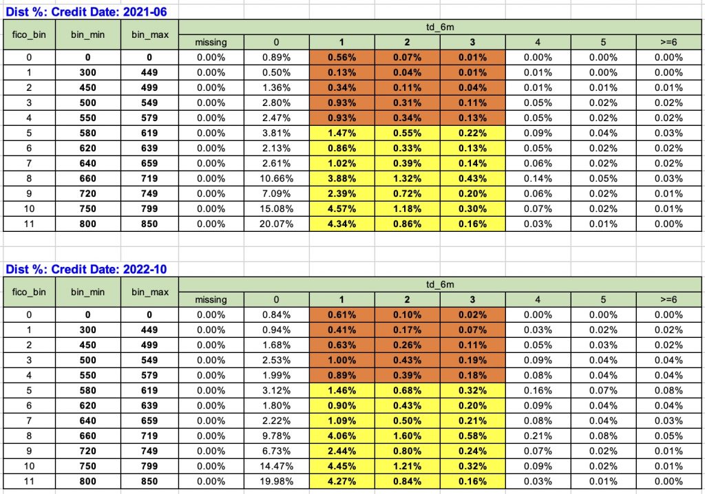 The two tables below represents two different time periods, the bookends of our observable period. The table on top is data from June 2021 stratified across credit score band. The table on the bottom of represents Oct 2022.